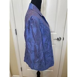 Chicos Design shimmery blue purple button down blouse with a hidden button placket. This beautiful blouse is 100% silk, with embroidery. This is a preowned blouse in very good condition. Measurements are armpit to armpit 21”, and the length is 26”