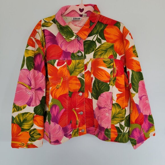 The jacket is in excellent pre worn condition. It shows little to no signs of wear. The beading work is still intact on various flowers. It is Chico's Design brand and is 100% Cotton. It needs to be dry cleaned only. It's a size 3 which is equivalent to an XL in women's.