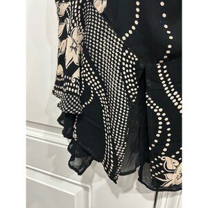 witchy boho, whimsigoth, bohemian, Chico's skirt, floral dot skirt, black beige skirt, ruffle hem skirt, rayon midi skirt, professional skirt, women's skirt, office wear skirt, India skirt, chic midi skirt, elegant skirt, work skirt