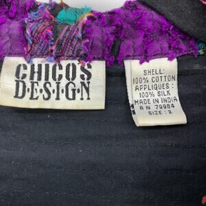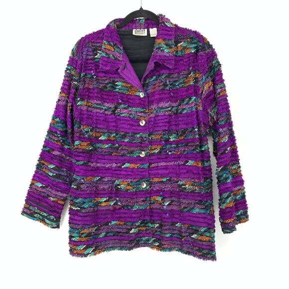 Chicos Design Shirt Jacket Womens Sz 2 US L Ruffle Purple Multicolor Silk Stripe