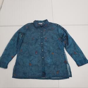 Chico's Design Shirt Womens Large Teal Sheer Embroidered Metallic Button Art