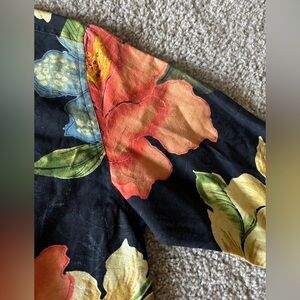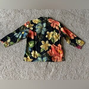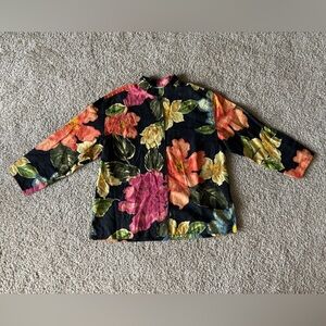 Chico's Design Mandarin Collar floral shirt jacket, lightweight top. Could be worn on its own or layered with another top underneath. Florals have a very fall feel to them. Oranges, yellow, blues. Glitter/sparkle throughout the fabric, very soft look. Linen blend. Perfect for your fall, winter, and spring gathering.