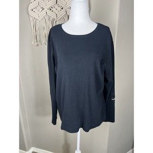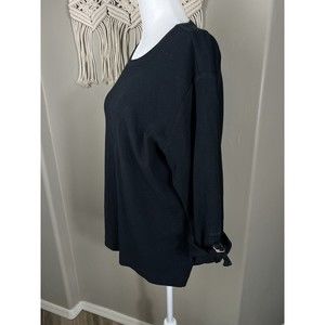 Description: Perfect everyday black long sleeve t-shirt from Chicos with roll tab sleeves. Materials: 98% cotton, 2% Spandex Size: Chicos Size 3 / US Size XL or 16 Approximate Measurements Lying Flat: Pit to pit- 21 Length shoulder to bottom- 24.5 Condition: Very good condition. No stains or flaws noted ALL ITEMS COME FROM A SMOKE-FREE HOME **THANKS FOR LOOKING** We ship MONDAY thru FRIDAY.