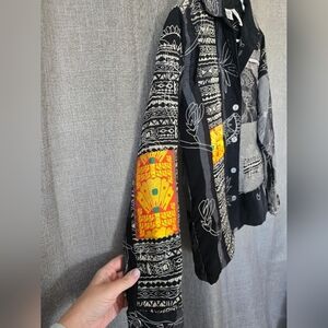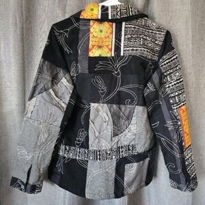 Add a touch of bohemian elegance to your wardrobe with this beautiful embroidered jacket from Chico's. The quilted patchwork design features a blend of black and colorful fabrics, creating a unique and eye-catching look. The jacket has long sleeves, a button closure, and is made of polyester.