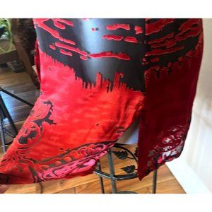 Chico's Design Sz 1 Red Black Floral Silk Top button Front Long Sleeve Split Hem. Beautiful and Elegant Blouse, very breezy and delicate. Pre-owned with gently used. No rips, tears or discolorations. Please check all pictures and measurements as they are part of the description. I invite you to always check my new listings. Thank you!!