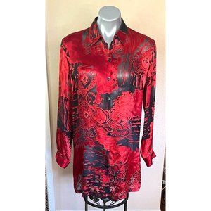 Chico's Design Sz 1 Red Black Floral Silk Top button Front Long Sleeve Split Hem