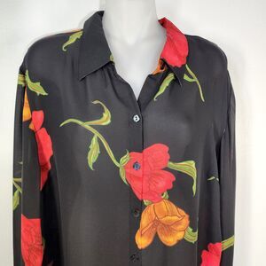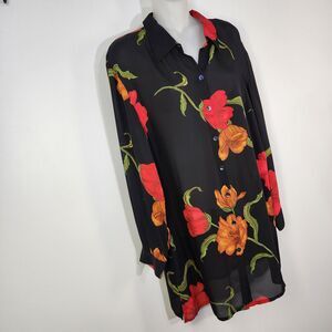 Chicos Design Top Sz 1 Medium 100% Silk Black Red Floral Sheer Vtg Button Tunic
