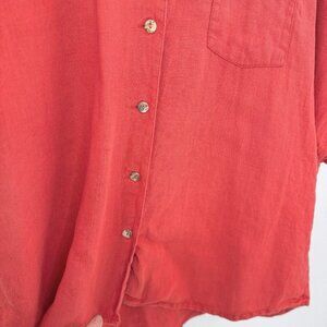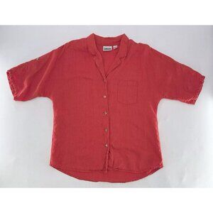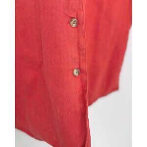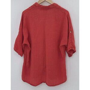 This Chico's Design shirt for women features a collared neckline and button closure, made of 100% linen fabric in Turkey. It has a stylish roll tab sleeve design and comes in a vibrant red color, perfect for summer, fall, and spring seasons. This button-up shirt in size 2 has a regular fit and is suitable for various occasions such as travel, workwear, and casual outings. With breathable fabric and a solid pattern, this Chico's shirt offers a designer touch to your wardrobe. A few faded spots on front of shirt. Please see photos for a better representation. Please feel free to ask any questions.