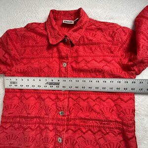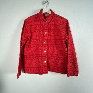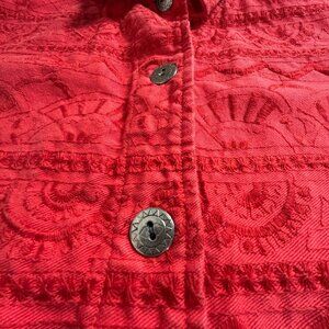 This Chico’s Design cotton jacket is a bold and beautiful piece, featuring rich red fabric accented with intricate embroidery and artsy detailing. With its button-front closure, long sleeves, and relaxed fit, it’s perfect for layering over tunics, dresses, or denim.