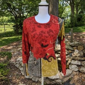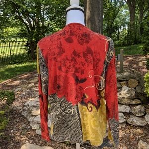 Mostly red-orange with yellow and gray patterned long sleeved Chico's Design shirt. The size is a Chico's 2, which is like a Medium/Large. From pit to pit is 21" and length (top to bottom) is 21.5"