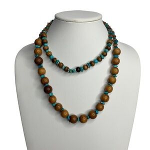 Chico’s Double Strand Brown Wooden Beads Turquoise & Brown Stone Chips Necklace