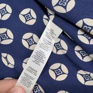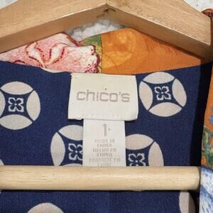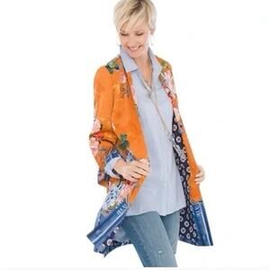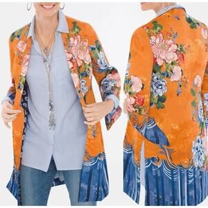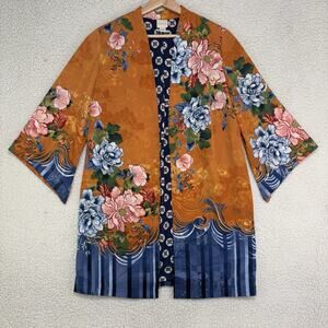 Chicos Drama Printed Kimono Sz 1 Floral Open Cardigan Gold Blue Satin Flowy