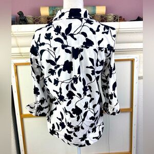 Truly gorgeous elegant wardrobe staple. Crisp no iron fabric w/ dramatic rose floral background. 3/4 Sleeves button & cuff up. Like new no wear or flaws. Pit to pit 21” shoulder to hem 26” front back 27”. Side vents have chic panel. Runs big. Perfect w/ short or long bottoms. Wear as tunic over skinny jeans or leggings. Add jacket. Magic.