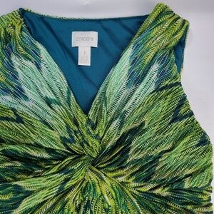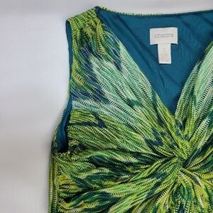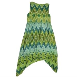 Chico's Maida Handkerchief IKAT Knit Asymmetric Hem Midi Dress. Sleeveless with Twist Bodice in Multiple Green Geometric Print.