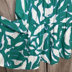 Chicos Dress Short Layered Puff Sleeves Pockets Green Leaves Poplin