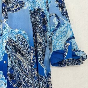 Chico's Duster Blouse Size L Blue White Paisley Button Up Semi Sheer Longline