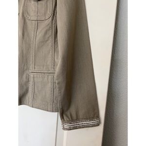 EUC. Beautiful Chico’s jacket with embellishments at collar and sleeves. The first hook closure shown in the last photo is loose and should be reinforced.