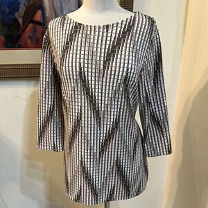 So pretty! Stylish top with a geometric pattern. Features a mix of brown, tan, and white. Perfect for any occasion. Easywear known for comfort. Perfect condition!