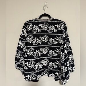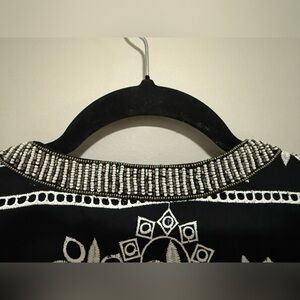Features a beautiful embroidered leaf eyelet pattern on a black cotton background; 3/4 sleeves; elastic cuffs; beaded collar