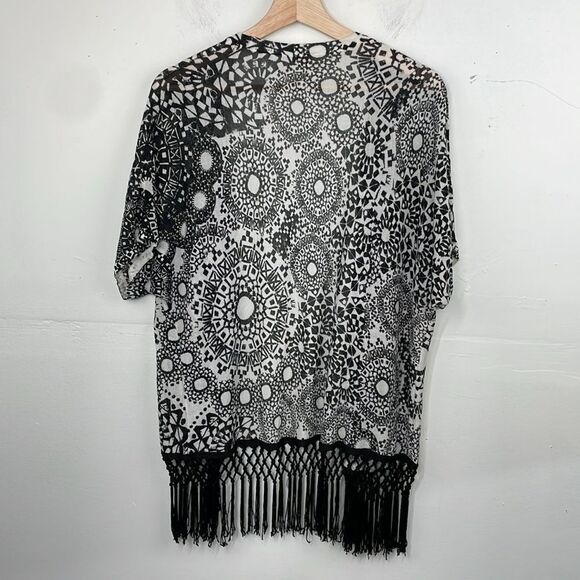 Because "something flowy" is always on-trend. This open-front cardigan is vividly rendered in a repeating medallion print, with braided fringe detail finishing off the hem.