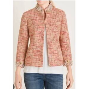 chicos tweed jacket, beaded collar blazer, embellished jacket, classic plaid tweed, statement outerwear, holiday party jacket, sophisticated chic style, luxury fashion coat, pearl beaded cuffs, elegant women’s jacket