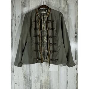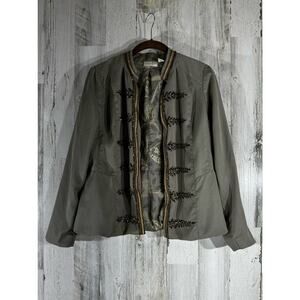 Chicos Embellished Military Jacket Size 0 Small Khaki Green Gold Bead Trim READ