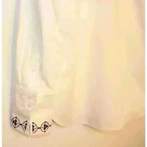 Add a unique touch to your wardrobe with this Chico’s button-up shirt. The floral embroidered accents and contrasting trim make this shirt perfect for any casual, business, or travel occasion. The lightweight and breathable fabric type (polyester and cotton blend) makes it suitable for all seasons. This classical Boho style shirt comes in a regular fit and is available in size 0.5 or XS (6US). The shirt features a collared neckline, classic/fitted sleeve type, and long sleeves. The shirt is machine washable and made in Thailand.