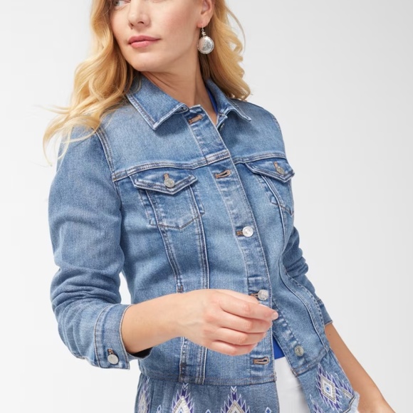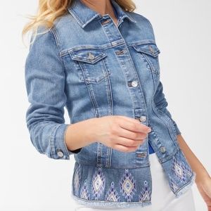 The Embroidered Peplum Denim Jacket has a feminine fit. This topper has all the hallmarks of a traditional jean jacket, but the peplum hem with a raw edge offers more flattering fit for this petite-friendly style. Featuring boho embroidery with sequins, this jean jacket is a perfect match for our Pull-On Embellished Embroidered Capris.