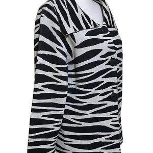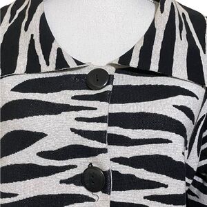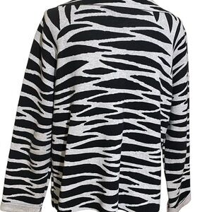 Add a bold statement to your wardrobe with this chic and trendy zebra print cardigan from Chico's. The classic black and white colors complement each other perfectly, making it a versatile addition to any outfit. It's perfect for any occasion, whether you're dressing up for a night out or keeping it casual during the day.