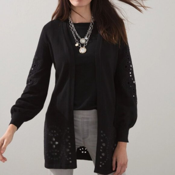Chico's Eyelet Cutout Longline Open Cardigan Sweater Black NWT Size Medium Boho