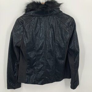 Luxury meets versatility with our softly sueded faux-leather jacket. The faux-fur collar is secretly removable for a more casual look. Snakeskin embossing and ribbed-knit sides enhance its uniquely modern appeal.