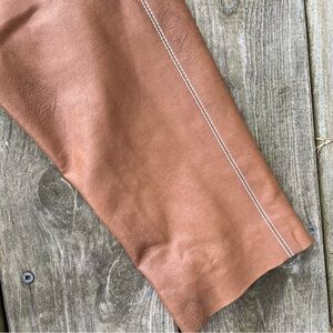Size Chicos 1 Large tan leather full zip jacket. Collared, white stitched embroidery.