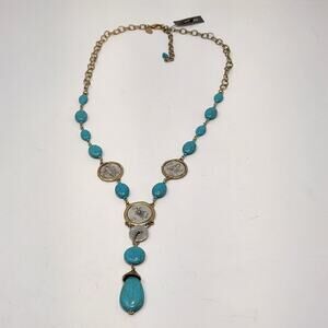 Chicos Faux Turquoise Coin Accent Long Necklace Two Tone Metal Y Drop Jewelry