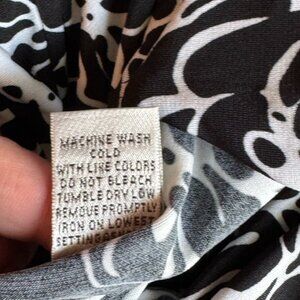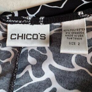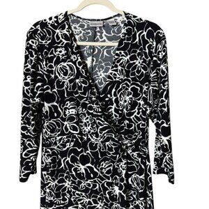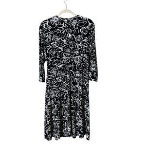 Chicos Faux Wrap Floral Dress Large Liquid Knit Midi Classy Artsy Career Wear Black White