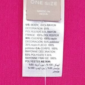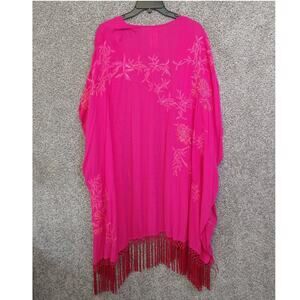 Brilliant hot pink color. Embroidered with knotted fringe. Open front with short bat wing sleeves. Very versatile. One size fits all. 100% rayon.