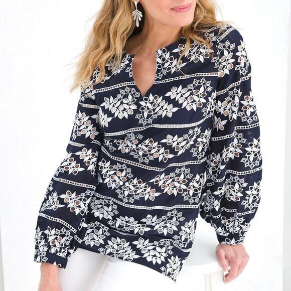 Chico’s Floral Embroidered Eyelet Tunic Top Womens Sz L Pullover Balloon Sleeves