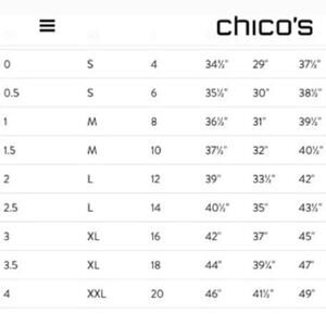 Excellent used condition. Chico’s size 3 is equivalent to a size L 12-14