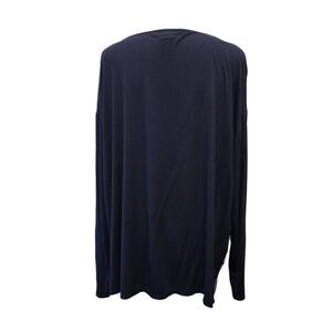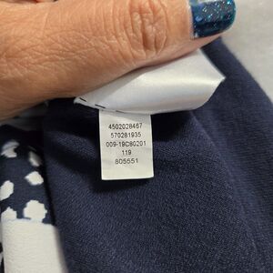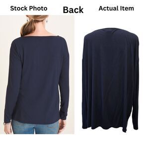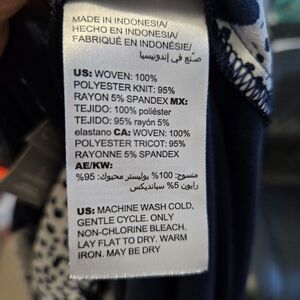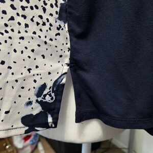 Floral dark blue and white pattern in front with solid dark blue in the back. Bateau neckline. Slightly stretchy fabric.