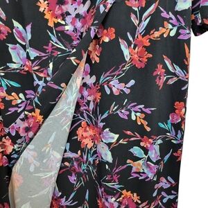 Size 2, 12/14. Black, Purple, Multi-Colored. Allover Floral Print. 3/4-Length Sleeves. V-Neckline. A-Line Silhouette. Midi Length. Faux Wrap. Gathered Front Detail. Pullover. Stretch Jersey Knit. Cotton Blend.