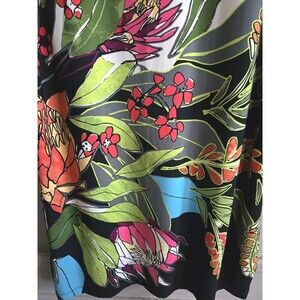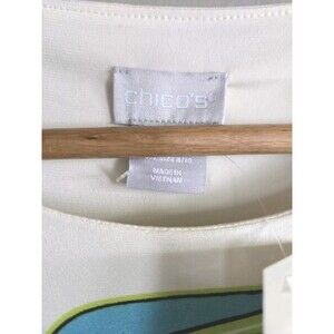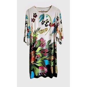 Elevate your wardrobe with this stunning Chico's shift dress in a beautiful multicolored floral print. The dress features 3/4 length kimono sleeves and a round neckline with a pullover closure. It comes in a size medium, with a knee-length hemline and is made of stretchy knit polyester fabric that ensures comfort and ease of movement.