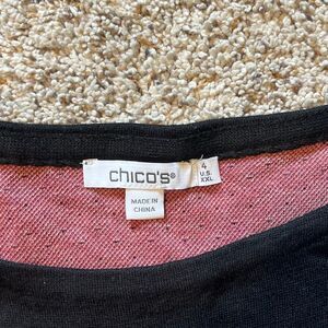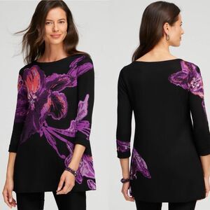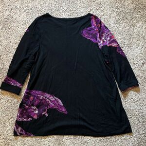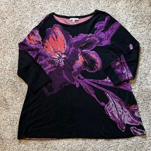 This beautiful sweater is made by Chico’s. It’s black with a purple and pink flower. 3/4 length sleeves and a longer length. Chico’s size 4 (XXL) and in great pre owned condition. Smoke and pet free home.