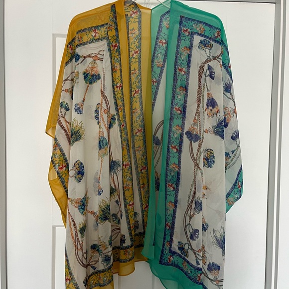 Elegant Chico's Ruana with vibrant floral patterns. Features rich yellow and green borders. Perfect for adding a touch of color.