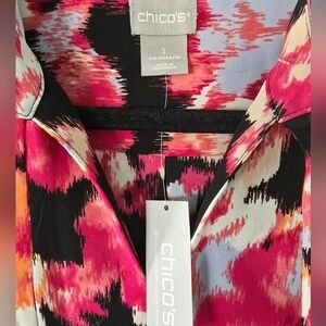 Add a splash of color to your wardrobe with this Chico's Floral Tie Detail Blouse. The blouse features a round neckline and button closure, with long sleeves and cap sleeves. The tie neck detail adds a unique touch to the blouse, making it perfect for any occasion, whether it be a casual day out or a party. The blouse is made from a lightweight chiffon material, which makes it perfect for all seasons.