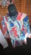 Chico's shirt with a vibrant paisley design. Features a mix of red, blue, and green tones.
