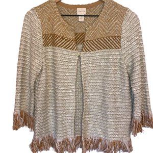 Chico’s Fringe Cuff hem Hook Latch Gold Silver Sparkle Cardigan Size 0