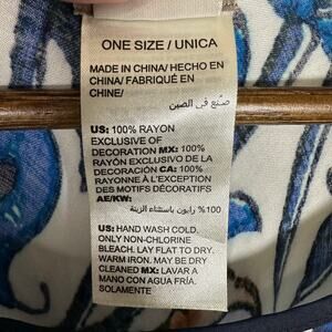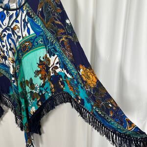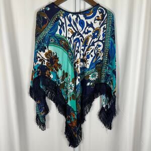 Chico's Fringe Poncho OS Blue Floral Colorblock Bohemian Resortwear Artsy