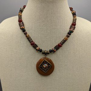 This is a very pretty boho style pendant necklace made of decorative beads in mixed shapes, colors, and materials, such as painted ceramic, metal, stone, acrylic. It features a large, round, beautifully designed pendant. The necklace is 16” long with an additional 3.5” extender, it has a lobster clasp with Chico’s drop tag and the pendant is 1.5” in diameter. Sold as is, returns are only accepted for errors in the description. Pictures, are part of the description.