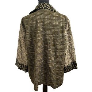 Stylish Chico's lightweight jacket with geometric patterns. Features black and tan colors. Perfect for layering. Size Large, Chico’s Size 2.