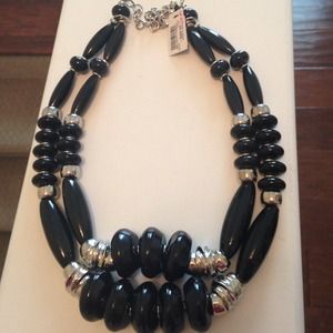 This striking black and silver set is up for your consideration. The stretch bracelet is 2" wide. The two-tier necklace adjusts from 21" to 25". The earrings are 2 3/4" long and are lightweight. A classic set that you'll reach for often! Gift boxed.