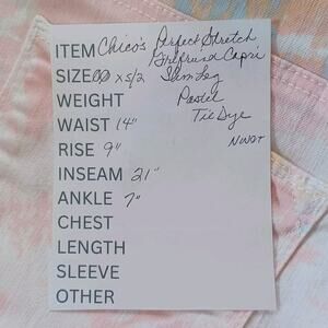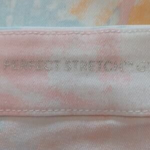 Chico's Perfect Stretch Girlfriend Slim Leg Capri 5 pocket stretch denim capri. White with pastel pinks and blues tie dye pattern. Women's Chico's Size 00, US XS/2 equivalent. Please see measurements in photos. All measurements are taken flat across. NEW without tag condition. No flaws. Bin 9